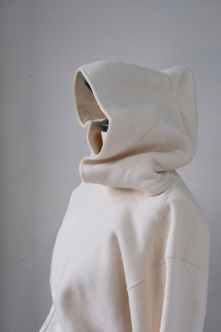 フチにヴィンテージの特殊ミシンでかがり縫いされた大きめなダブルフェイスフードは