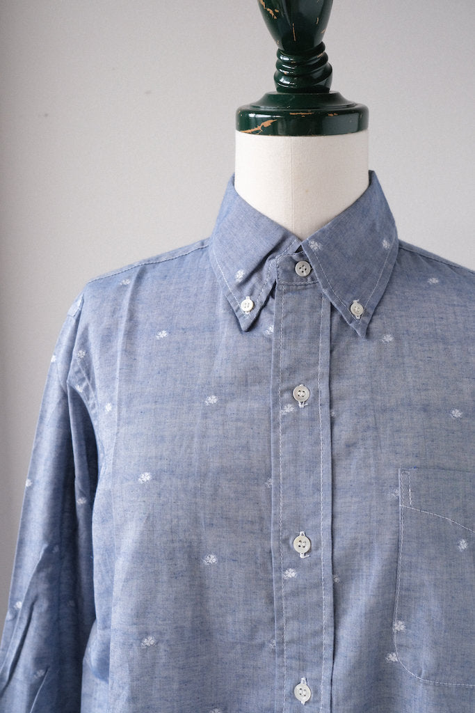 サラッとしたインディゴシャンブレーに四葉のクローバーの刺繍が入った